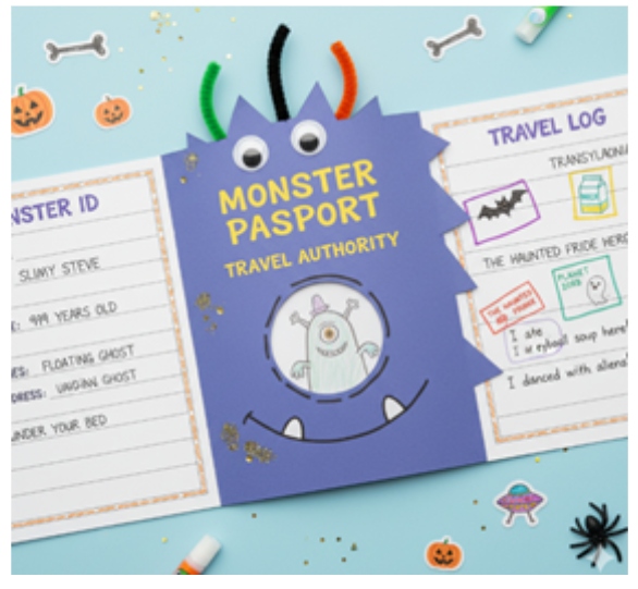 Corta el “pasaporte” de cartulina con la forma de tu monstruo y añade un título terrorífico como Passport to Panic… En el interior, la sección de “foto” debe ser una ventana para hacer un dibujo. Crea otras páginas para incluir Nombre, Edad, Especie, Altura, Hogar. Nivel de Peligro y Susto Favorito. Comida Favorita. Contacto de emergencia. Firma del Monstruo.